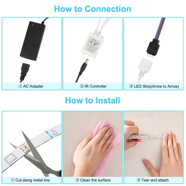 - Cuttable and linkable: Led strip light can be cut between every 3 leds without damaging the rest strips.A power adapter and remote control is required but not included