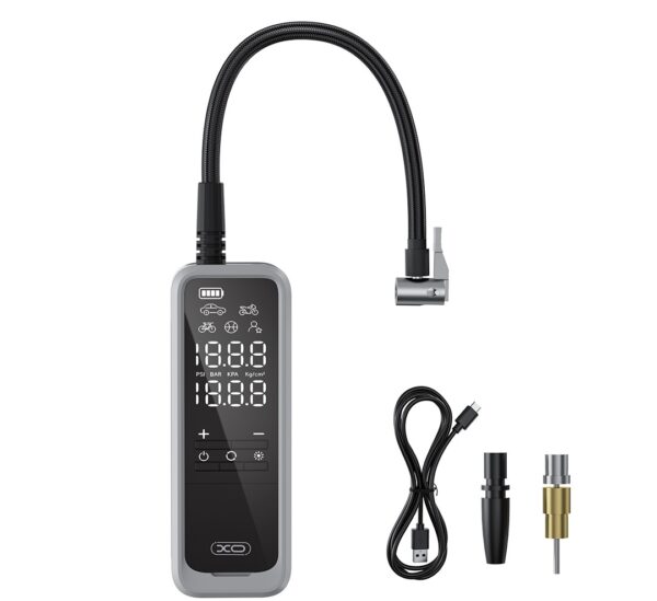Model: XO-CZ018 Wireless Inflatable Pump Input voltage: 5.0V DC ■Power: 85W max.; air flow: 23-25L/min ■Control mode: key + display screen ■Cigarette lighter cable length: none ■Air tube size: 30cm ■LED Lighting: 1 LED light ■Cylinder: 22mm ■Noise: ≤80dB ■Interface type: Type-C ■Charging time: 3 hours 27 minutes ■Charger mode: 5V/2.1A ■Capacity: 5000mAh/3.7V ■Function: tire pressure detection, inflation pump, night lighting ■Operation: see specifications ■Use environment: -0-40 ℃, this product is suitable for: cars, motorcycles, electric cars, all kinds of bicycles, all kinds of balls, balloons, life buoys, swimming rings; ■Product material: ABS, PC ■Product weight: 586g (± 2g) ■Product size: 186.3*67.2*53.2mm ■Color: black + gray Accessories: ball needle * 1, the U.S. turn method nozzle * 1, inflatable conversion head * 1, Type-C cable * 1, rotary press air tube